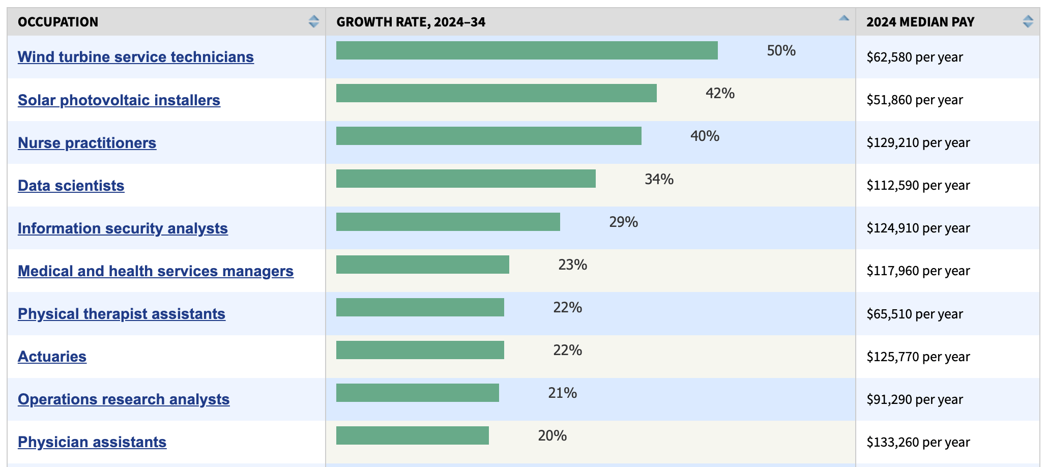 Keep reading to see charts showing projected openings, along with data on median annual wages, at each of the education levels. For comparison, the median annual wage for all occupations was $49,500 in 2024. (A median wage is the point at which half of workers made more than the amount, and half made less.)"